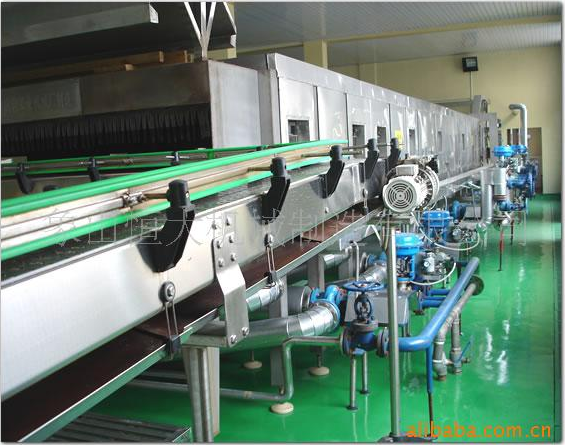 本機(jī)是按巴氏殺菌原理進(jìn)行設(shè)計,分為7個溫區(qū),其中1、2、溫區(qū)為預(yù)熱區(qū),3為高溫區(qū),4、5為主殺菌區(qū),6、7為降溫區(qū)。整個系統(tǒng)配用7臺水泵,其中水溫高于85℃的三個溫區(qū)配用3臺高溫水泵。用直接式加熱器分別向預(yù)熱區(qū)、高溫區(qū)、殺菌區(qū)供熱。蒸汽供給量由自動控制系統(tǒng)調(diào)節(jié)。主要部分組成:殺菌機(jī)箱體、進(jìn)瓶鏈道、出瓶鏈道、管道系統(tǒng)。
