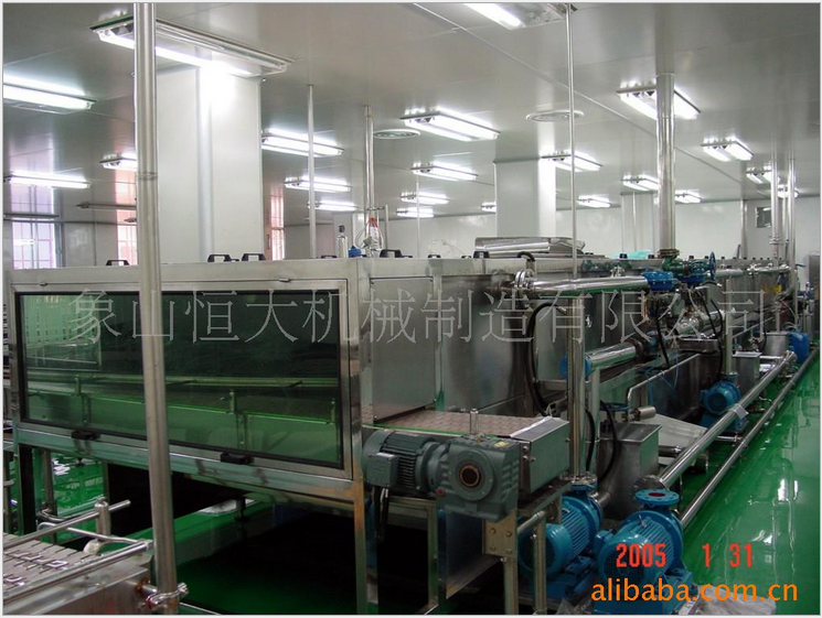 功能描述:由輸送帶傳送過來的包裝瓶在噴淋冷卻機入口處排瓶,順序進入噴淋冷卻機,首先到達第一溫區(qū),在第一溫區(qū)保溫3分鐘(73℃),隨后順序進入第二和第三溫區(qū)逐漸降溫,時間為12分鐘,此溫區(qū)循環(huán)水循環(huán),外接冷卻塔,第四溫區(qū)降溫到35—40℃,此溫區(qū)用脫鹽水冷卻,補水時多余水進入上一溫區(qū),并設有吹干裝置。